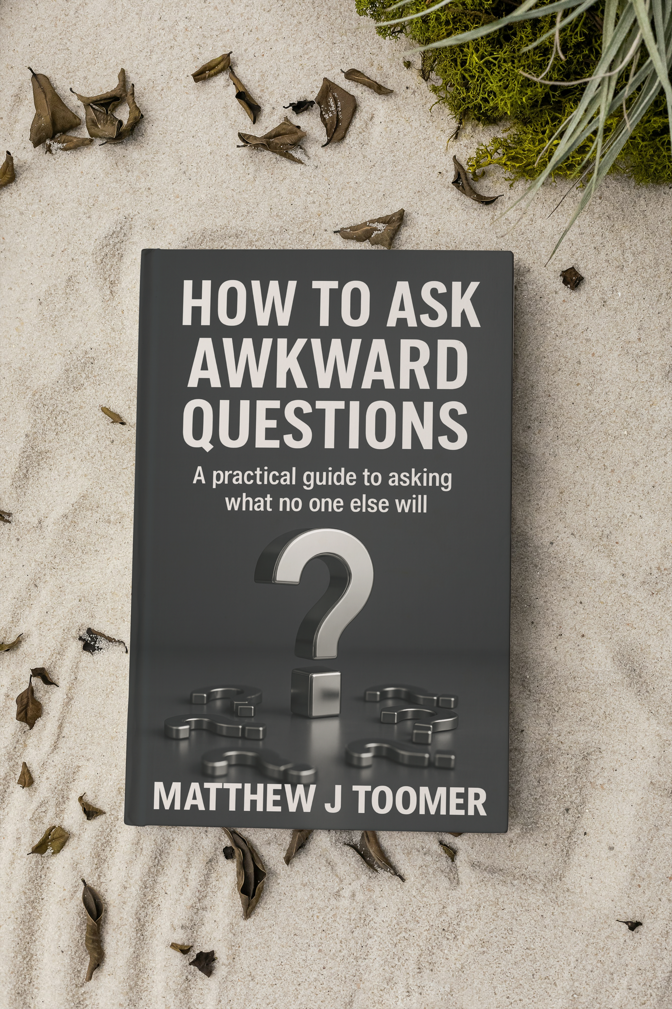The cover centres on a single metallic question mark, grounded and dimensional, symbolising weight and consequence. The use of a dark background reinforces seriousness and depth, while the clean white typography communicates directness. The hierarchy is deliberate. The title dominates the composition, reinforcing the central theme of asking what others will not.