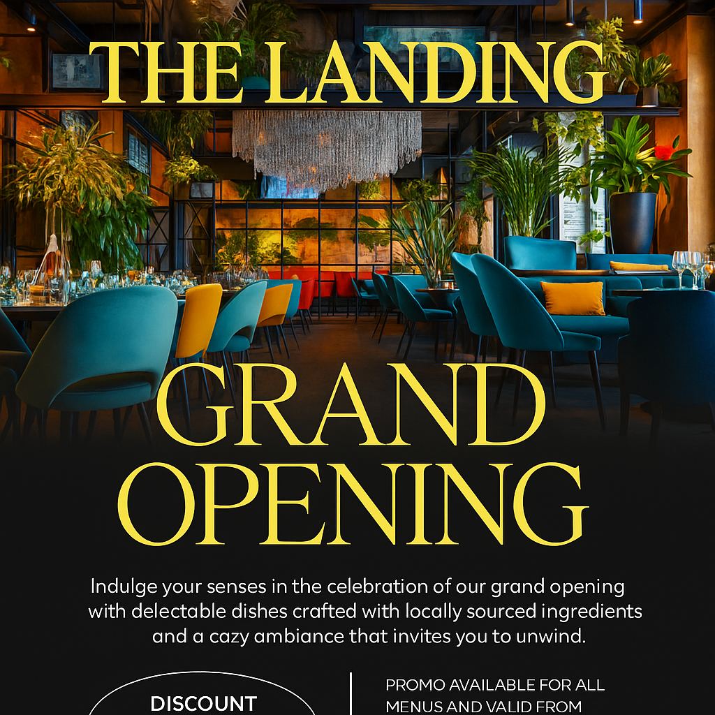 The Landing, a stylish new restaurant in the heart of Reading, approached me to create a bold and inviting flyer for their grand opening campaign. The brief was simple: make it luxurious, modern, and unmissable. The flyer needed to reflect the vibrant interiors of the venue while clearly promoting a 25% discount available during the opening week.